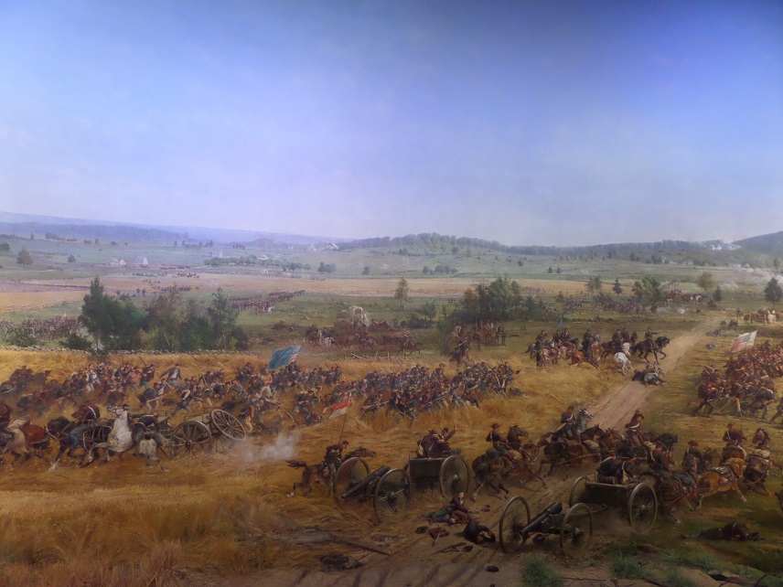 There is so much to say about this amazing painting. Briefly, about 20 years after the Battle of Gettysburg, Paul Philippoteaux created the Gettysburg Cyclorama (it took him and five assistance a year and a half to complete).